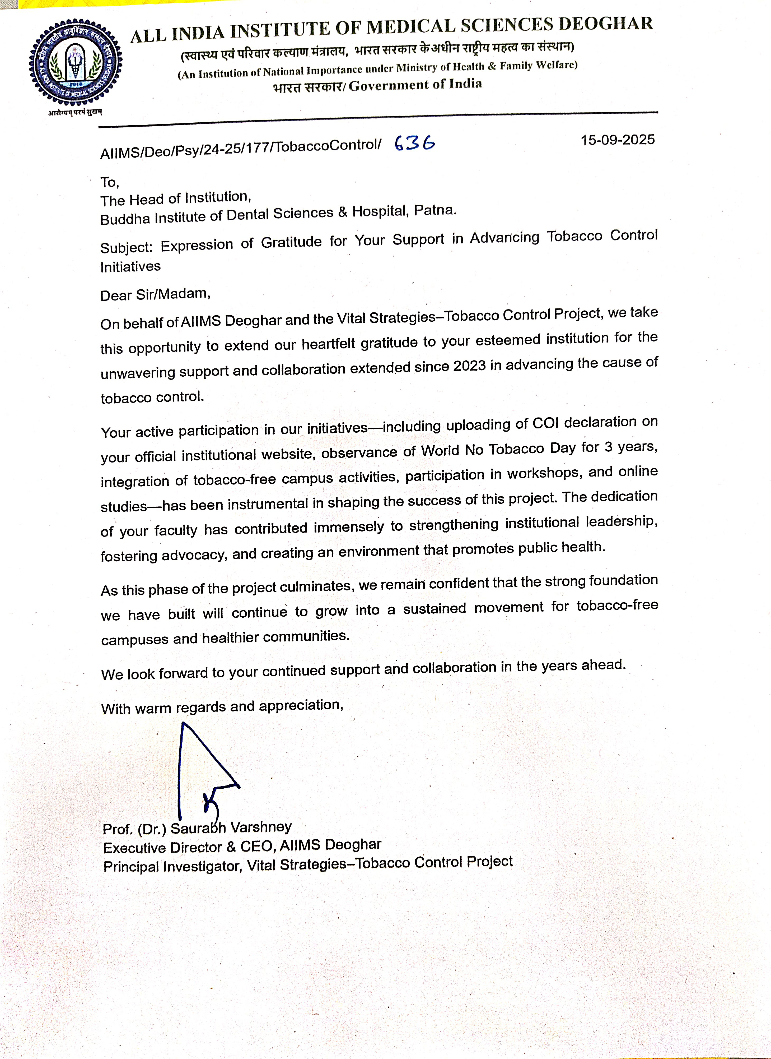 The department of Public Health Dentistry, BIDSH in collaboration with AIIMS Deoghar participated in an Advanced Tobbaco control project. A letter of Appreciation and two paper publications was also received for the same..