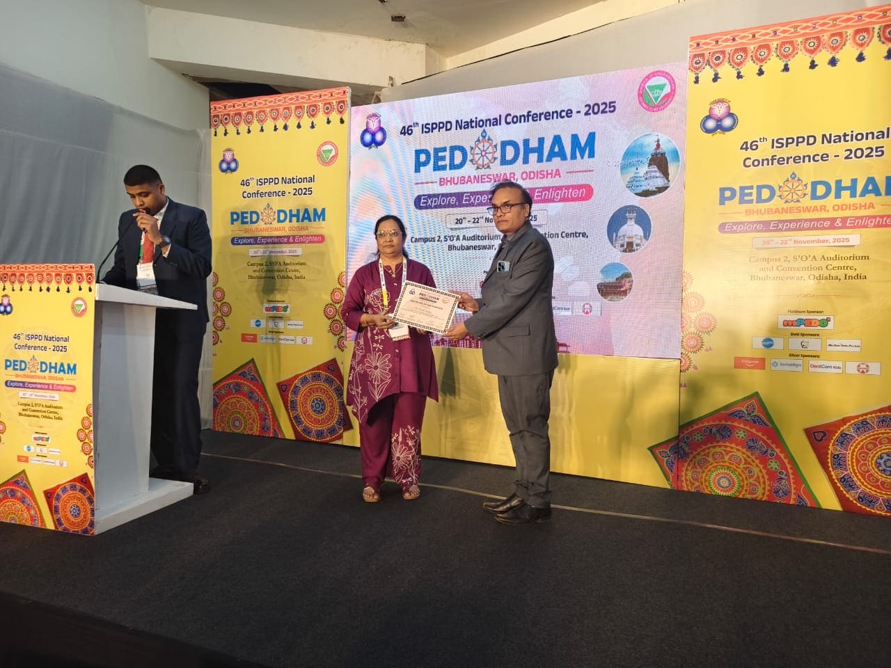 46th ISPPD conference"Pedodham"was held in Bhubaneshwar,Odisha from 20th -22nd Nov.2025.There was active participation from the Dept.of Pediatric & Preventive dentistry of Buddha Institute of Dental Sciences & Hospital.Head Of Department, Dr. Chitrita Gupta Mukherjee was invited as a guest Speaker on the topic"Checklist Manifesto in Action:Rethinking Pediatric Dental Anesthesia". Other faculties such as Dr. Arvind kumar and Dr. Swati singh had faculty paper presentation.They also chaired several sessions. All PGT'S presented papers & posters in the same.One of the post graduate trainee Dr. Shweta Subham received best scientific paper in the conference under student category.